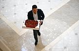 An extraordinary meeting of the Federation Council (FC) of Russia to discuss candidates for the posts of heads of law enforcement agencies and the Ministry of Foreign Affairs of Russia. Genre photography. A man carries a box of fresh strawberries in the lobby of the building of the Northern Fleet of Russia.