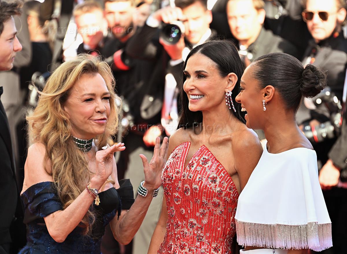 77-й международный Каннский кинофестиваль / Festival de Cannes 2024. День четвертый. Слева направо: сопрезидент компании Chopard Каролин Шойфеле, актрисы Деми Мур и Софи Уайлд на премьере фильма "Виды доброты".