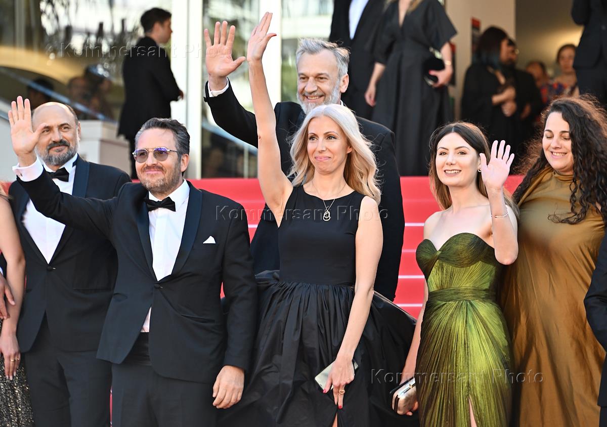 77th International Cannes Film Festival / Festival de Cannes 2024. Day four. Director Emanuel Parvu (second from left) and screenwriter and producer Miruna Berescu (center) before the premiere of the film "Three Kilometers to the End of the World."