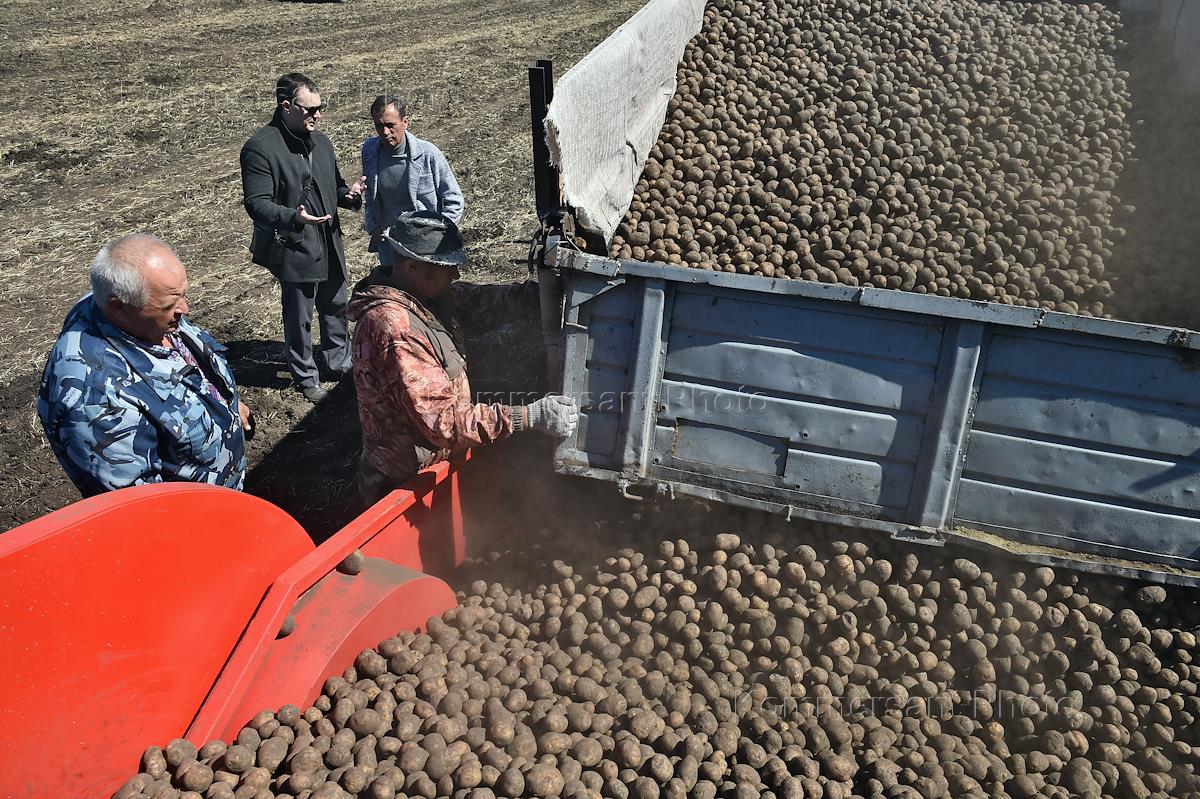 Начало посевной кампании в Новосибирской области. Жанровая фотография. Сотрудники АО "Совхоз"Морской" в селе Ленинское во время посадки чипсового картофеля.