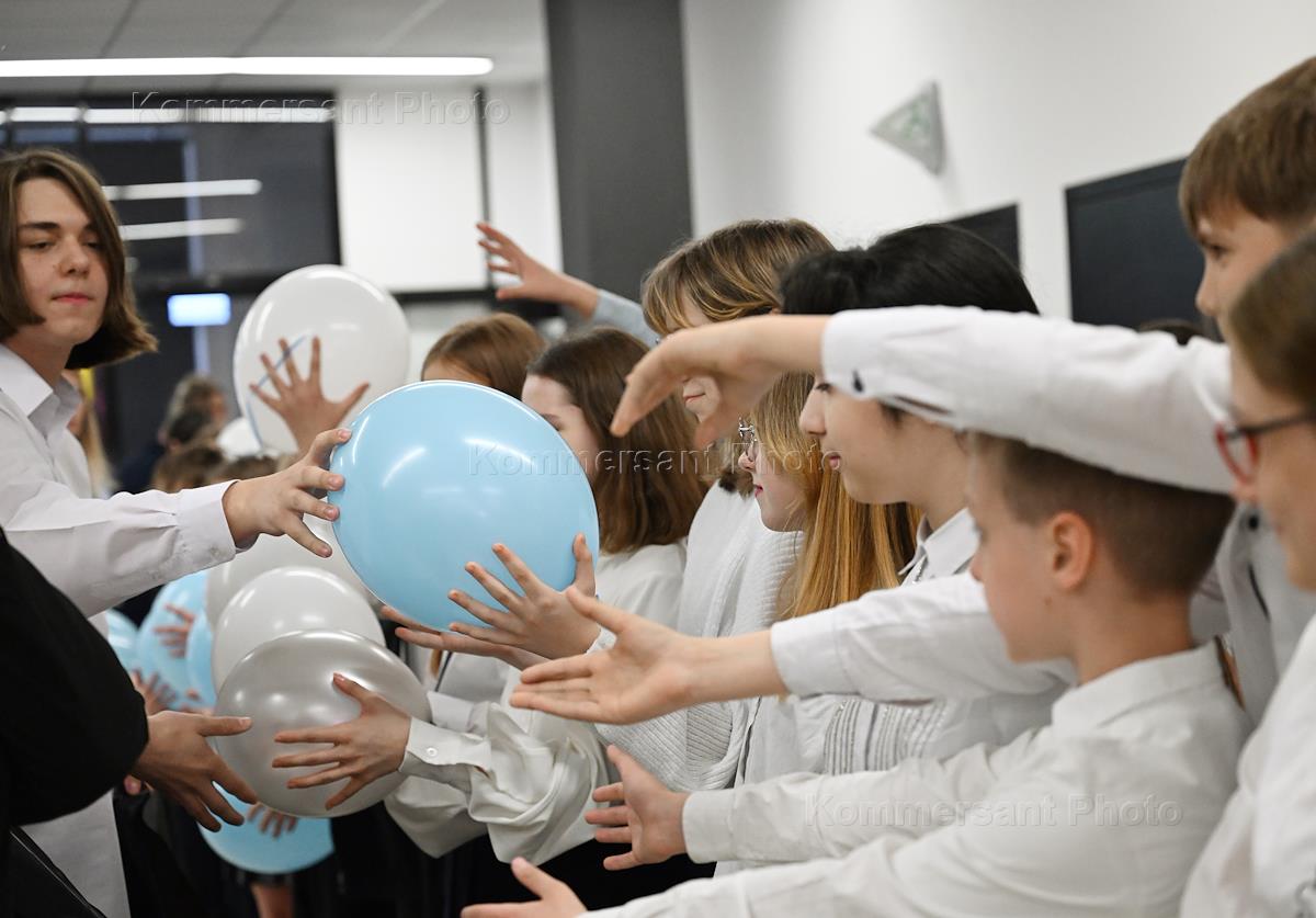 Праздник "Последний звонок" для выпускников 11-ых классов в Государственном бюджетном общеобразовательном учреждении города Москвы "Школа № 158". Жанровая фотография. Ученики средней школы в коридоре перед началом праздника.
