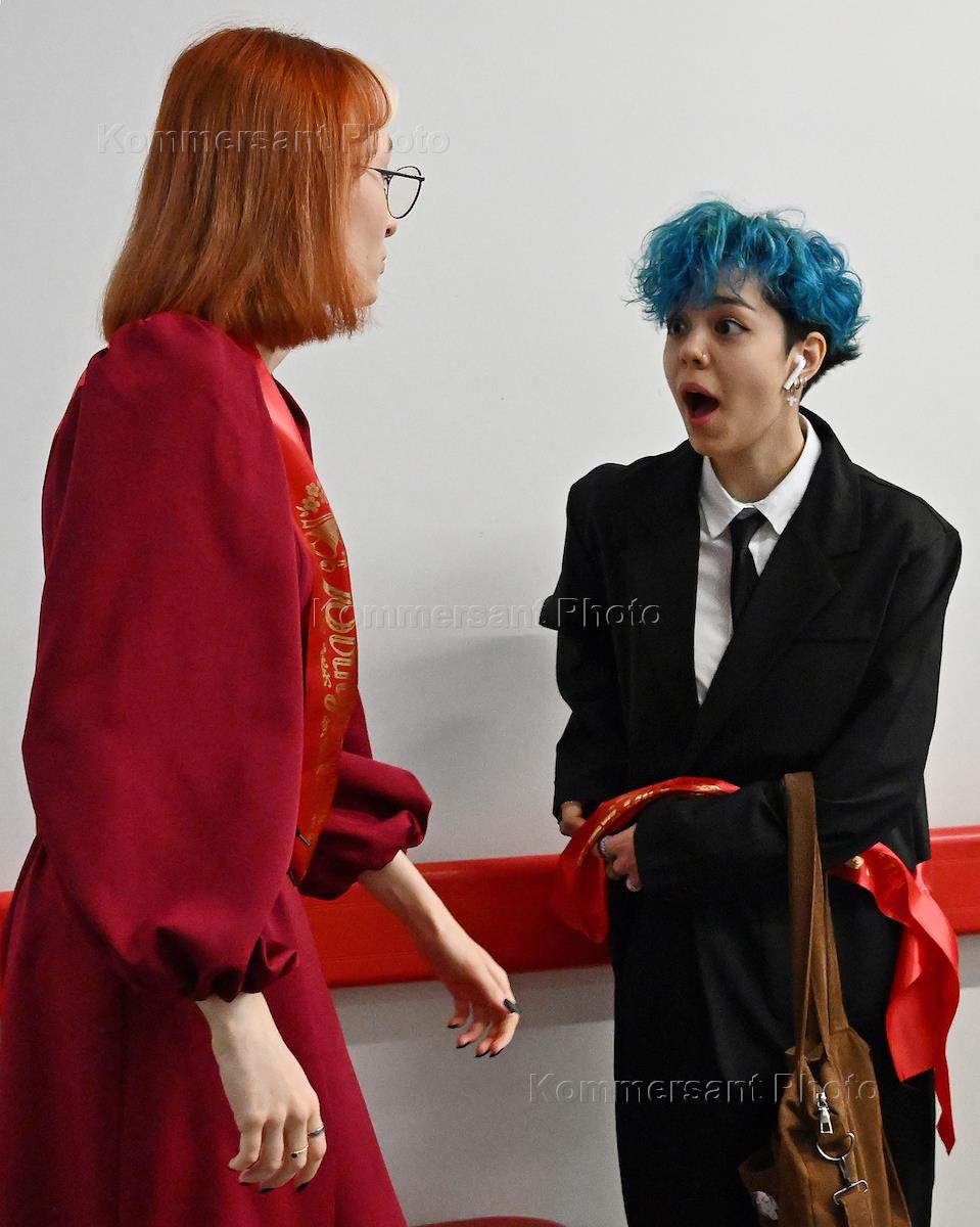 Праздник "Последний звонок" для выпускников 11-ых классов в Государственном бюджетном общеобразовательном учреждении города Москвы "Школа № 158". Жанровая фотография. Ученики средней школы в коридоре перед началом праздника.
