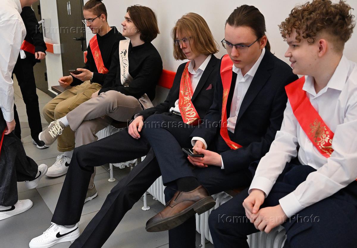 Праздник "Последний звонок" для выпускников 11-ых классов в Государственном бюджетном общеобразовательном учреждении города Москвы "Школа № 158". Ученики средней школы перед началом праздника.