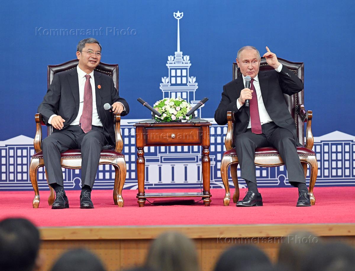 Рабочая поездка президента России Владимира Путина в Китай. Президент России Владимир Путин (справа) и председатель совета Харбинского политехнического университета Сюн Сыхао (слева) на встрече со студентами и преподавателями Харбинского политехнического университета.