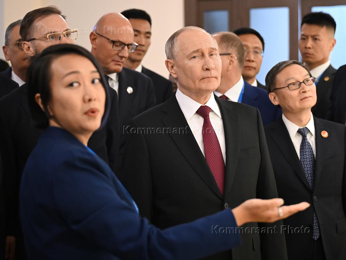 Рабочая поездка президента России Владимира Путина в Китай. Президент России Владимир Путин (в центре) во время осмотра экспозиции в Харбинском политехническом университете.