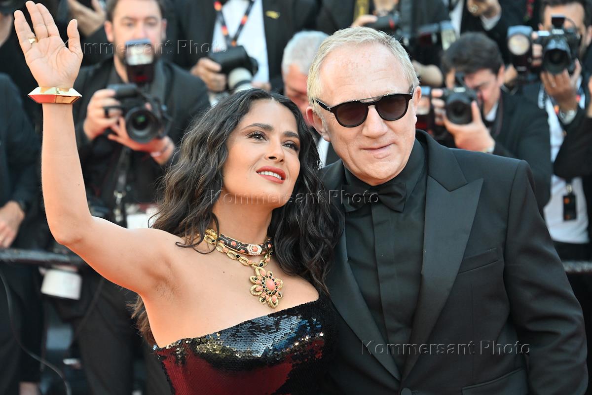 77-й международный Каннский кинофестиваль / Festival de Cannes 2024. День пятый. Актриса Сельма Хайек (слева) и бизнесмен Франсуа-Анри Пино на премьере фильма "Эмилия Перес".
