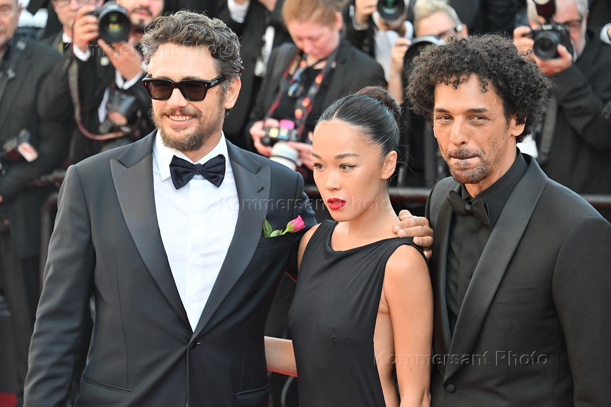 77-й международный Каннский кинофестиваль / Festival de Cannes 2024. День пятый. Слева направо: актеры Джеймс Франко, Элиза Тиллолой и Томер Сислей на премьере фильма "Эмилия Перес".