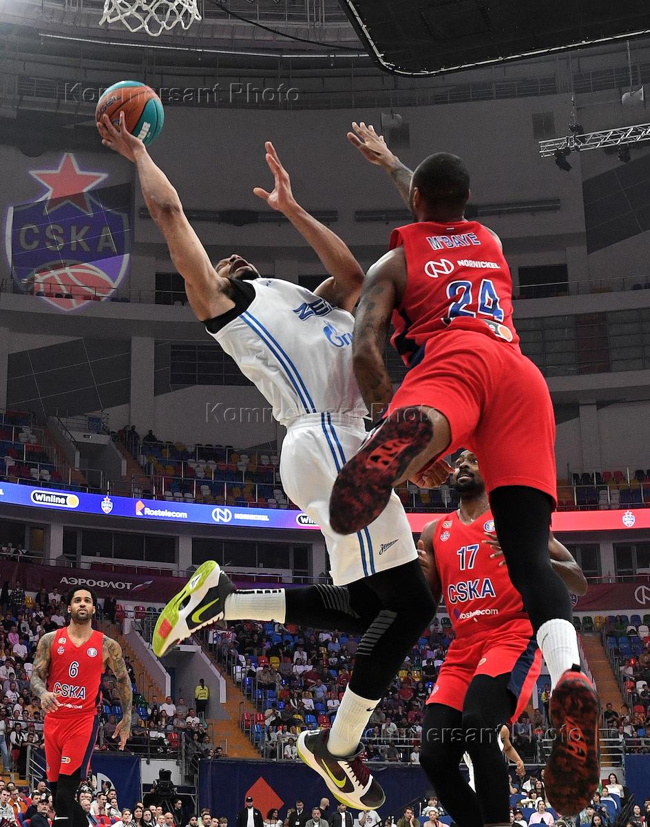 Единая лига ВТБ по баскетболу. Матч между командами ЦСКА (Москва) - "Зенит" (Санкт-Петербург) на спортивной арене "Мегаспорт". Игрок команды "Зенит" Винс Хантер (справа) во время матча.