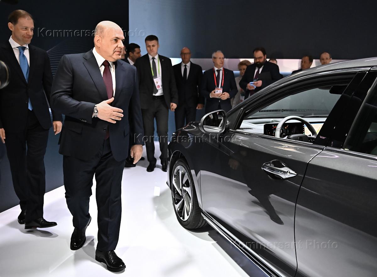 Рабочая поездка председателя правительства России Михаила Мишустина в Нижний Новгород. Церемония открытия IX конференции цифровых технологий "ЦИПР-2024". Павильон марки автомобиля VOLGA на выставке конференции.