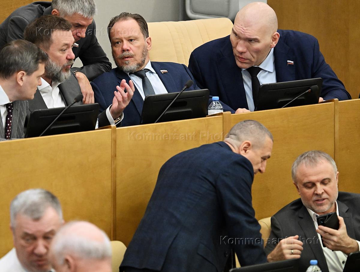 Пленарное заседание Государственной думы (ГД) России. Первый заместитель председателя комитета ГД России по туризму и развитию туристической инфраструктуры Николай Валуев (справа) и первый заместитель председателя комитета ГД России по культуре Александр Шолохов (в центре) во время заседания.