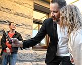 Церемония вручении II премии Гильдии кастинг директоров России в театре "На Малой Бронной". Актриса Олеся Судзиловская (справа) и ее супруг, бизнесмен Сергей Дзебань (слева) на церемонии.
