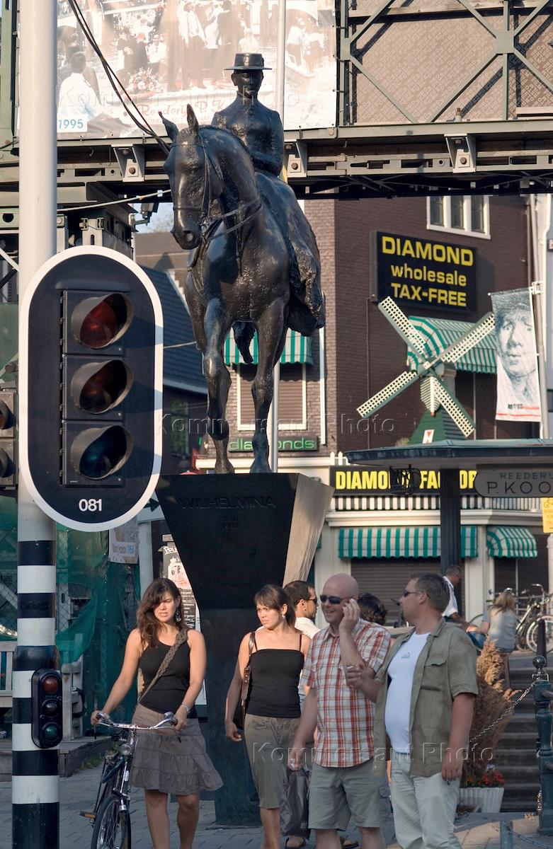 Люди гуляют по улице города у подножья памятника королеве Нидерландов Вильгельмине.