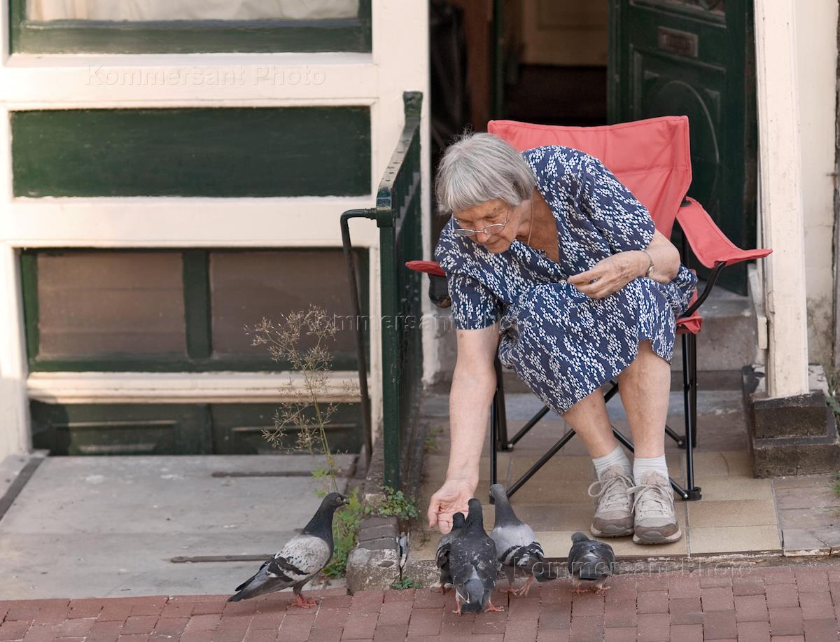 Пожилая женщина кормит голубей у порога своего дома.