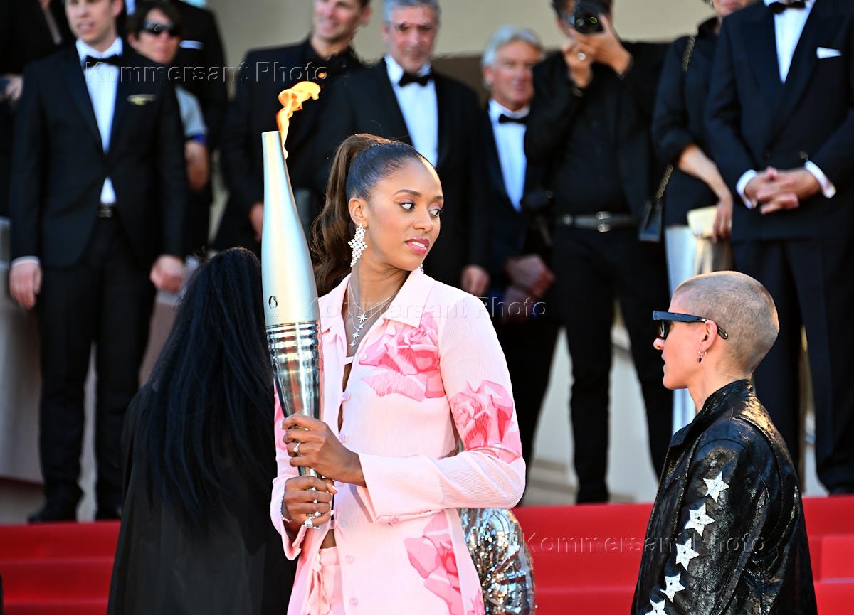 77-й международный Каннский кинофестиваль / Festival de Cannes 2024. День восьмой. Баскетболистка Илиана Рупер с Олимпийским огнем, в преддверии Олимпийских игр-2024, на красной дорожке перед Дворцом фестивалей и конгрессов.