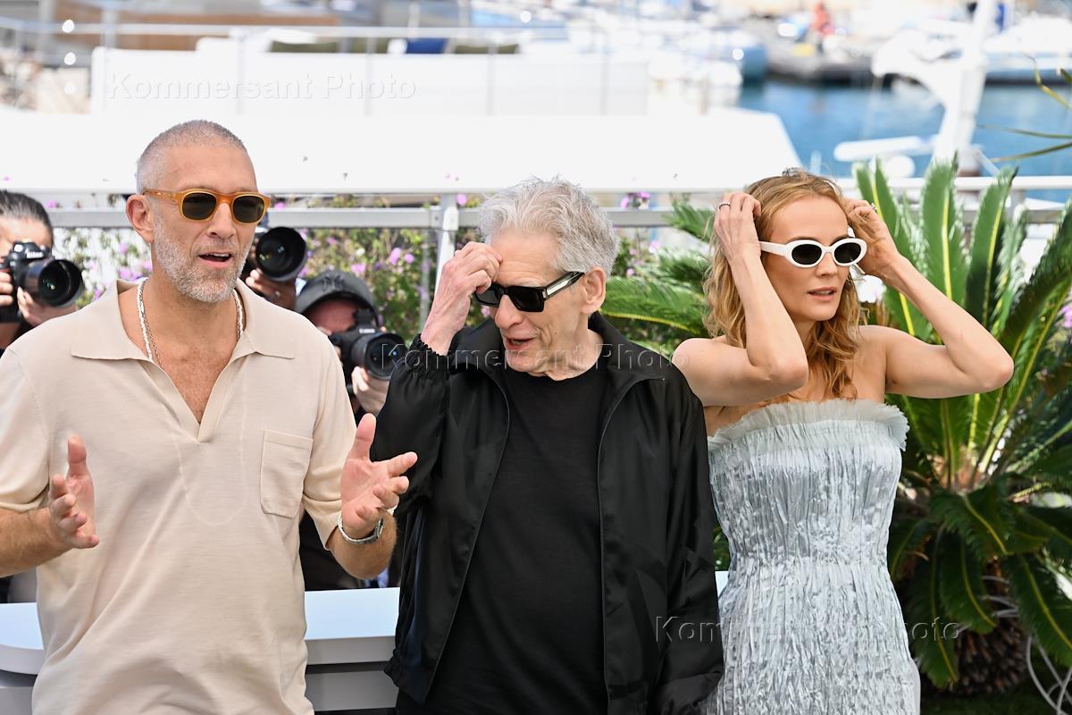 77-й международный Каннский кинофестиваль / Festival de Cannes 2024. День восьмой. Слева направо: актер Венсен Кассель, режиссер Дэвид Кроненберг и актриса Диана Крюгер во время фотосессии съемочной группы фильма "Саван".
