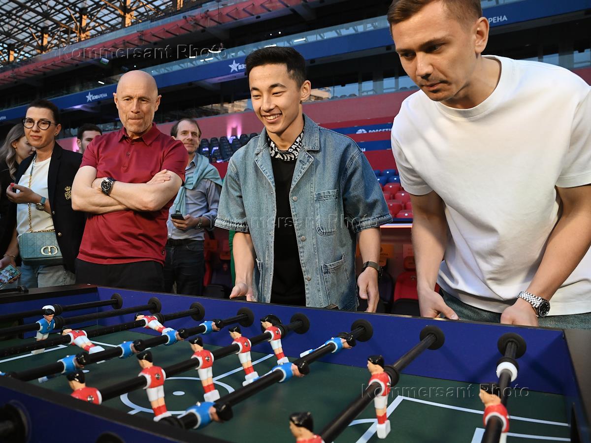 Вечер по случаю коллаборации бренда GOLD’N APOTHEKA с футбольным клубом ЦСКА на стадионе "ВЭБ Арена". Игрок команды ЦСКА Аббосбек Файзуллаев (слева) во время автограф-сессии.