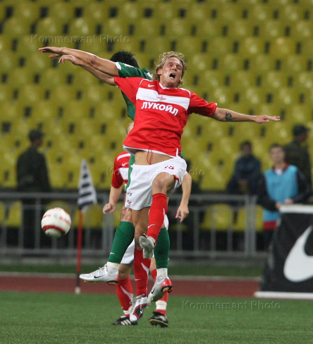 Russian football championship. Spartak (Moscow) vs. Rubin (Kazan) 3-0. Rubin halfback Ansar Ayupov, left, and Spartak halfback Radoslav Kovac, center. Match has passed at Luzhniki stadium.