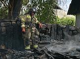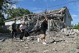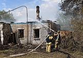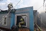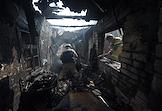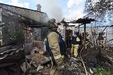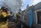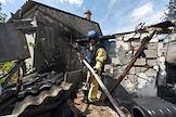 Последствия обстрела Макеевки. Сотрудники пожарной службы во время обследования жилого дома после пожара.