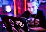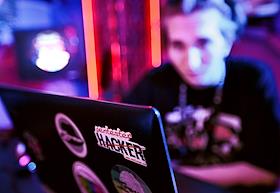 Форум по информационной безопасности Positive Hack Days в смешанном формате в спортивном комплексе "Лужники". Жанровая фотография. Надпись на рукаве футболки "В ритме техно".