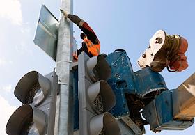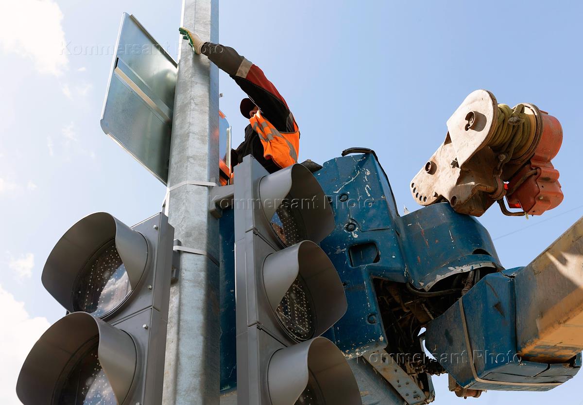 Жанровая фотография. Начало сезона ремонта дорог в городе. Дорожные рабочие во время установки дорожных знаков на столбах.