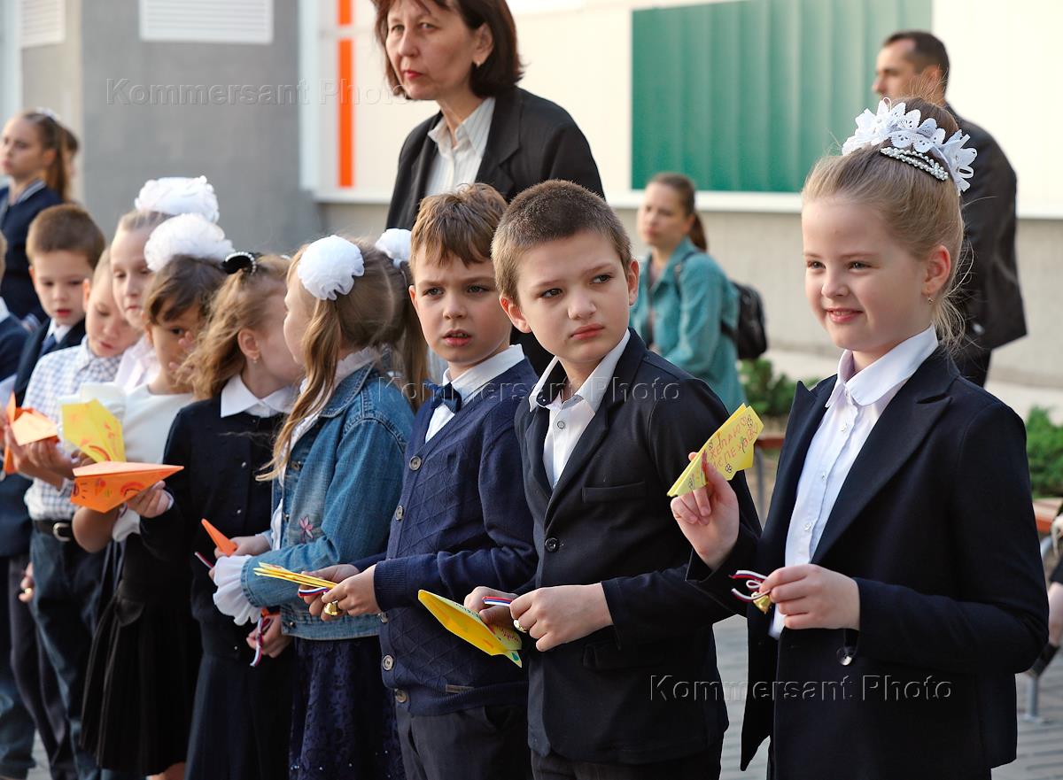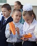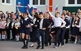 Торжественная линейка, посвященная окончанию учебного года в МОУ СШ № 123. Праздник "Последний звонок". Жанровая фотография. Ученики начальной школы на празднике.