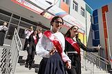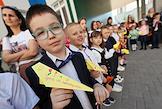 Торжественная линейка, посвященная окончанию учебного года в МОУ СШ № 123. Праздник "Последний звонок". Жанровая фотография. Ученики начальной школы во время выступления на празднике.