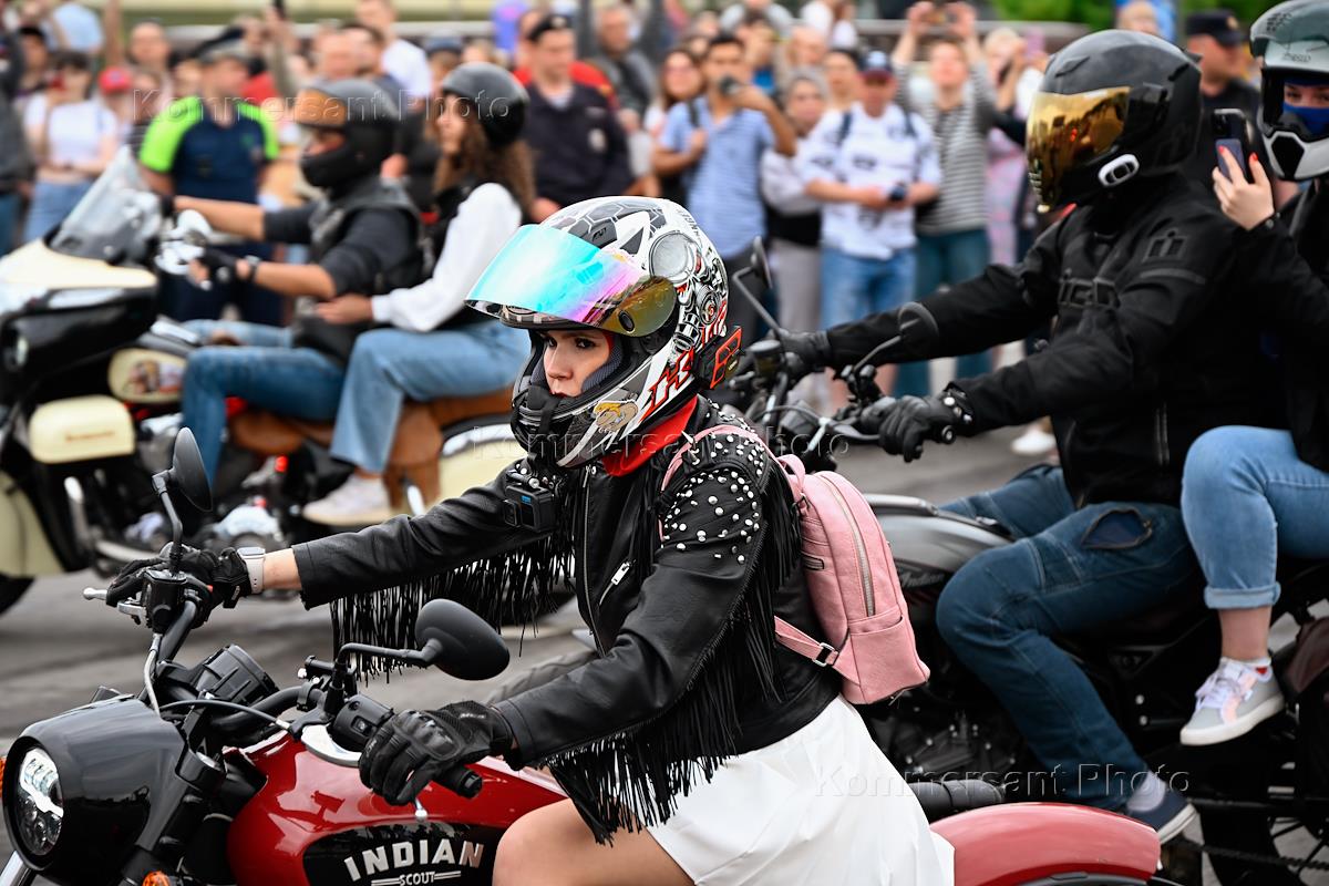 Церемония открытия мотосезона на Воробьевых горах. Жанровая фотография. Девушки участницы церемонии на мотоциклах.