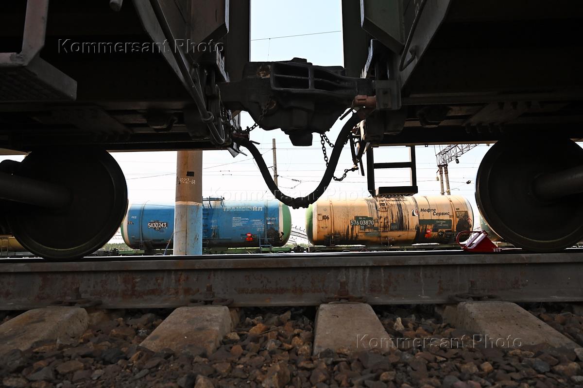 Пресс-тур по Байкало-Амурской магистрали (БАМ). Жанровая фотография. Вагоны грузового поезда на узловой станции Тайшет Тайшетского региона Восточно-Сибирской железной дороги.