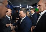 Предварительное электронное голосование по отбору кандидатов от партии "Единая Россия" на предстоящие в сентябре региональные выборы. Церемония соединения ключей шифрования прошла в Центральном исполкоме партии. Заместитель руководителя фракции "Единая России" в Государственной думе России Евгений Ревенко (в центре) во время церемонии.