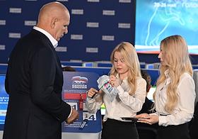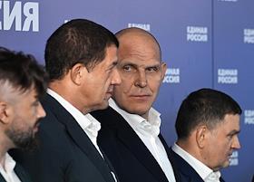Предварительное электронное голосование по отбору кандидатов от партии "Единая Россия" на предстоящие в сентябре региональные выборы. Церемония соединения ключей шифрования прошла в Центральном исполкоме партии. Представитель в Совете Федерации России от законодательного (представительного) органа государственной власти Новосибирской области Александр Карелин (слева) во время церемонии.