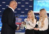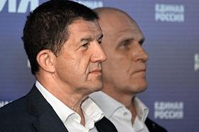 Предварительное электронное голосование по отбору кандидатов от партии "Единая Россия" на предстоящие в сентябре региональные выборы. Церемония соединения ключей шифрования прошла в Центральном исполкоме партии. Представитель в Совете Федерации России от законодательного (представительного) органа государственной власти Новосибирской области Александр Карелин (справа) и президент ПАО "Ростелеком" Михаил Осеевский (слева) во время церемонии.