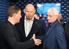 Предварительное электронное голосование по отбору кандидатов от партии "Единая Россия" на предстоящие в сентябре региональные выборы. Церемония соединения ключей шифрования прошла в Центральном исполкоме партии. Представитель в Совете Федерации России от законодательного (представительного) органа государственной власти Новосибирской области Александр Карелин (справа), руководитель Центрального исполнительного комитета партии "Единая Россия" Александр Сидякин (слева) и представитель от исполнительного органа государственной власти Ленинградской области, заместитель секретаря Генерального совета партии "Единая Россия" Сергей Перминов (в центре) во время церемонии.