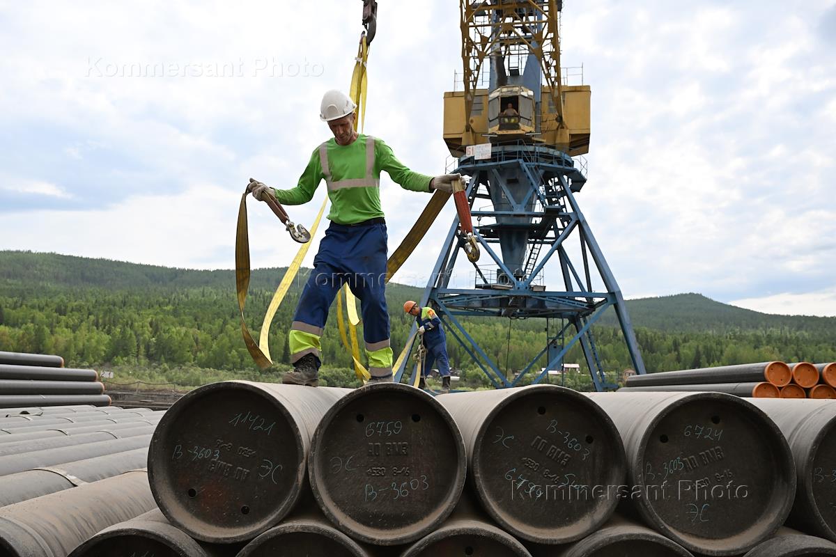 Усть-Кутский речной порт Осетрово на реке Лена. Центр перевалки грузов для северных территорий. Оборудование для строительства газопровода "Сила Сибири". Жанровая фотография. Рабочий во время загрузки труб.