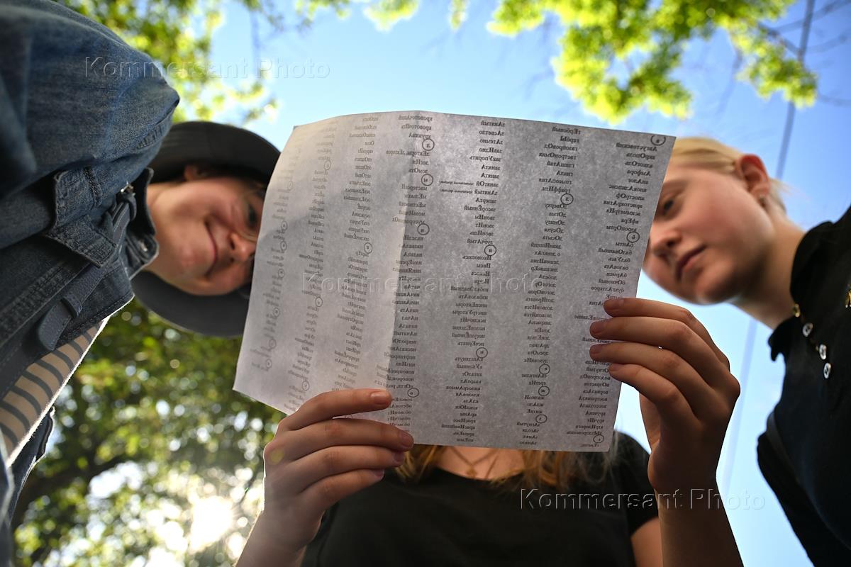 Проведение Единого Государственного Экзамена (ЕГЭ) по русскому языку в Общеобразовательной школе №199. Выпускники перед началом экзамена во дворе школы.