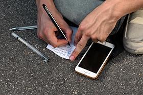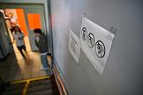 Проведение Единого Государственного Экзамена (ЕГЭ) по русскому языку в Общеобразовательной школе №199. Жанровая фотография. Значки, запрещающие пользование мобильными устройствами во время экзамена.
