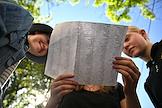 Проведение Единого Государственного Экзамена (ЕГЭ) по русскому языку в Общеобразовательной школе №199. Выпускники перед началом экзамена во дворе школы.