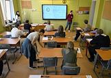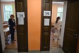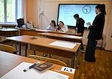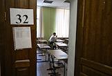 Проведение Единого Государственного Экзамена (ЕГЭ) по русскому языку в Общеобразовательной школе №199. Преподаватели в пронумерованных аудиториях перед началом экзамена.