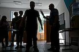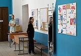 Проведение Единого Государственного Экзамена (ЕГЭ) по русскому языку в Общеобразовательной школе №199. Организаторы во время регистрации учащихся.
