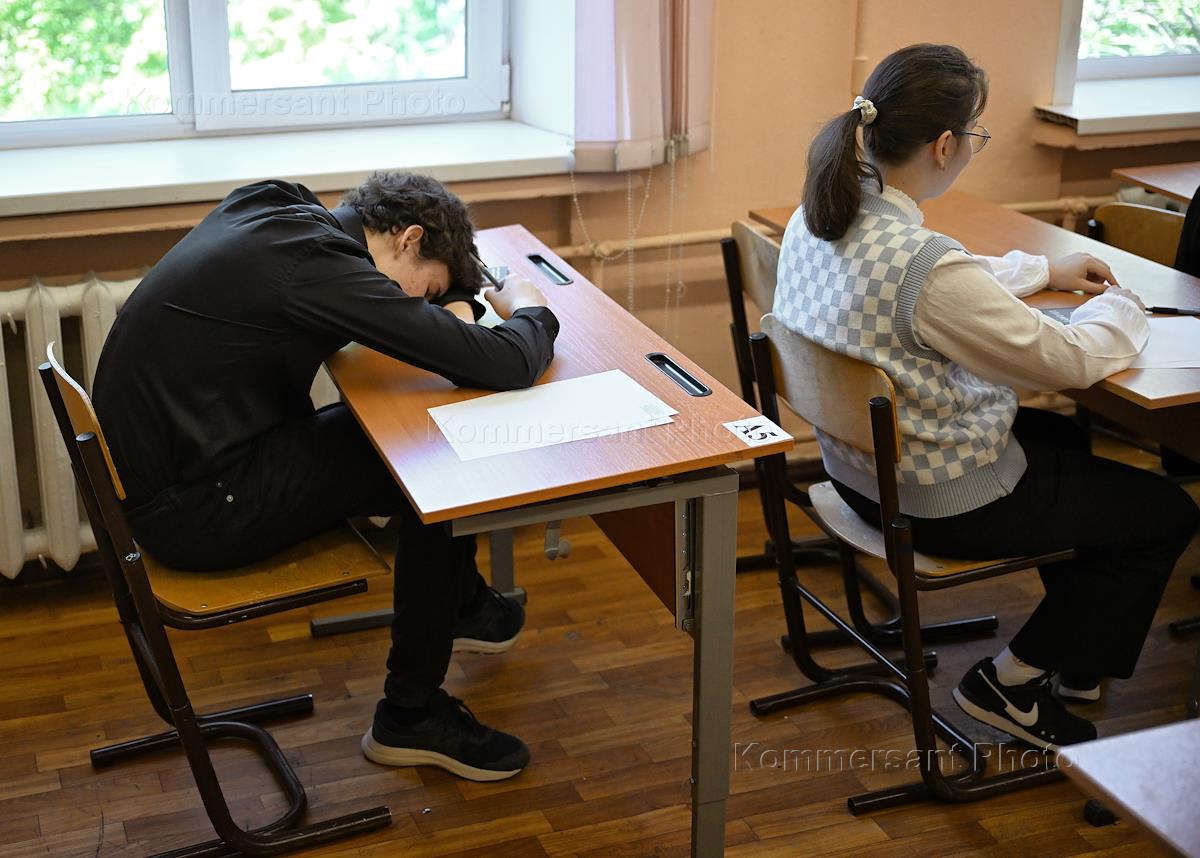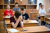 Проведение Единого Государственного Экзамена (ЕГЭ) по русскому языку в Общеобразовательной школе №199. Учащиеся в классе перед началом экзамена.