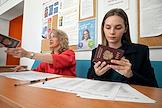 Проведение Единого Государственного Экзамена (ЕГЭ) по русскому языку в Общеобразовательной школе №199. Учащаяся с паспортом в руках перед началом экзамена.
