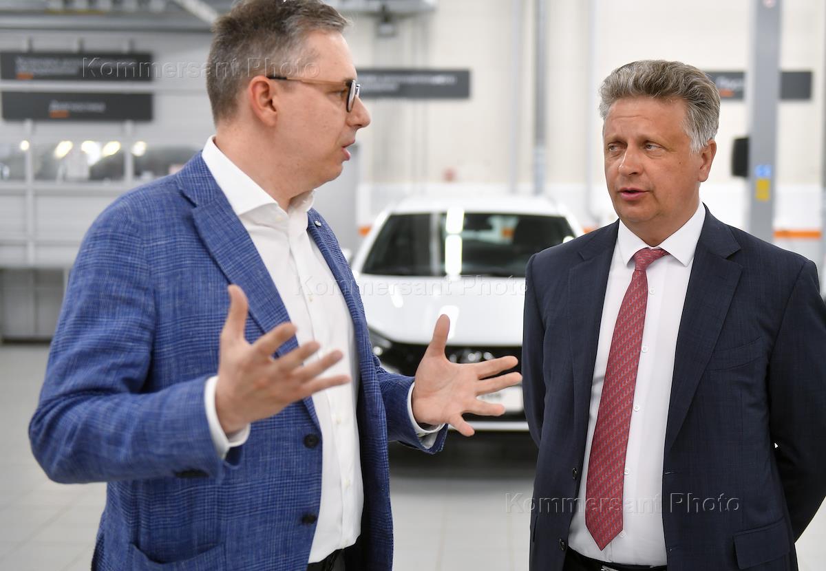 Церемония открытия группой компаний "Автопродикс" дилерского центра "Автопродикс LADA". На церемонии были представлены модели XCITE X-Cross 7 (собранный на бывшем заводе Nissan) и LADA Vesta Cross. Президент АО "АВТОВАЗ" Максим Соколов (слева) и управляющий директор компании "Автопродикс" Андрей Гвозденко (справа) на церемонии.
