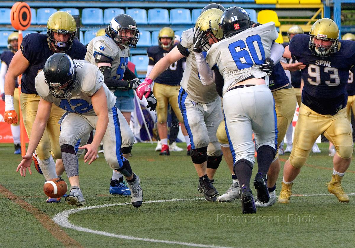 Чемпионат России по американскому футболу. Матч между командами "Грифоны" (Санкт-Петербург) — "Северный Легион" (Санкт-Петербург) на Малой спортивной арене (МСА) "Петровский". Игроки во время матча.