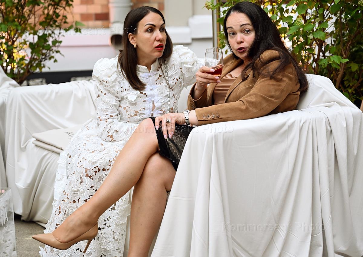 Летняя вечеринка телеграм-канала "Антиглянец" во дворике отеля "Метрополь". Главный редактор журнала "Москвичка" Дарина Алексеева (слева) и ресторатор Ирина Зарькова (справа) на вечеринке.