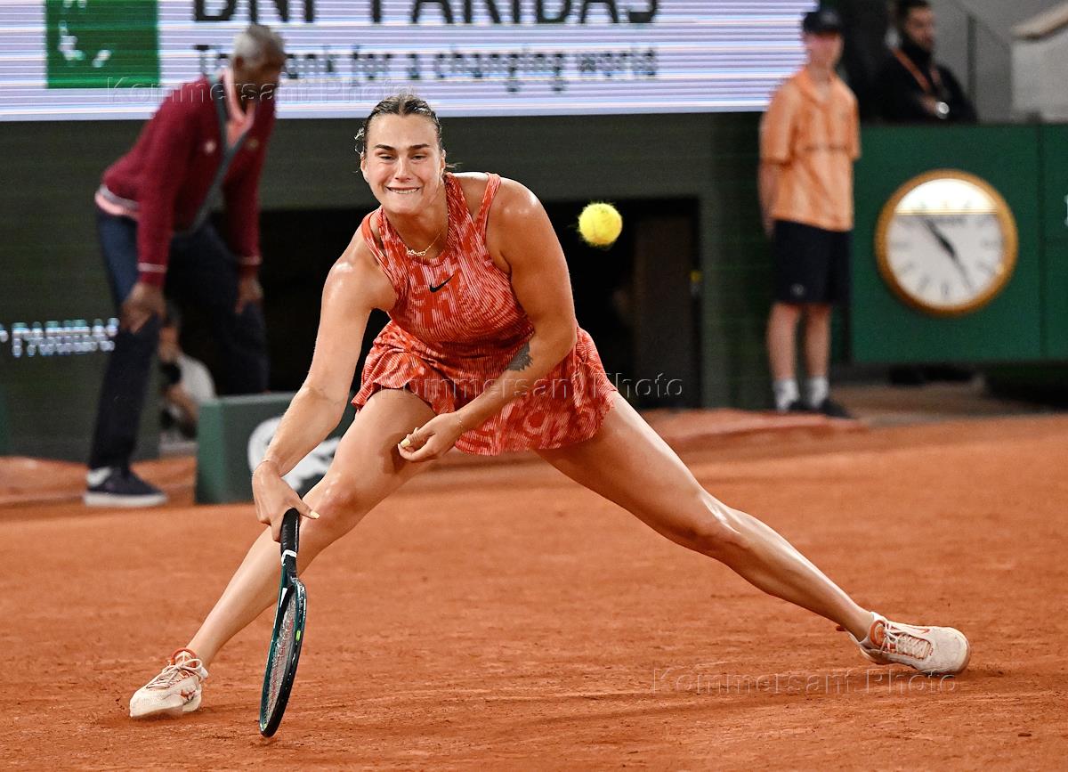 Открытый чемпионат Франции по теннису "Ролан Гаррос-2024" (Roland Garros). Женщины. 1-й круг. Белорусская теннисистка Арина Соболенко во время матча с российской теннисисткой Эрикой Андреевой.