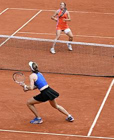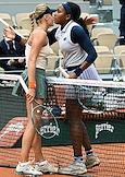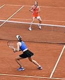 Открытый чемпионат Франции по теннису "Ролан Гаррос-2024" (Roland Garros). Женщины. 3-й круг. Итальянская теннисистка Елизабетта Кочаретто (справа) и российская теннисистка Людмила Самсонова (слева) во время матча.