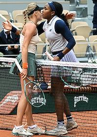 Открытый чемпионат Франции по теннису "Ролан Гаррос-2024" (Roland Garros). Женщины. 3-й круг. Американская теннисистка Кори Гауфф (справа) и украинская теннисистка Даяна Ястремская (слева) во время матча.