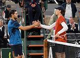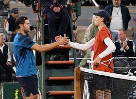Открытый чемпионат Франции по теннису "Ролан Гаррос-2024" (Roland Garros). Мужчины. 3-й круг. Итальянский теннисист Янник Синнер (справа) и российский теннисист Павел Котов (слева) после матча.