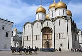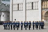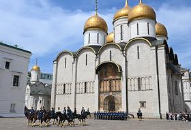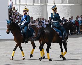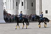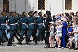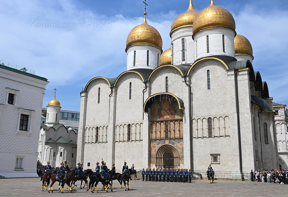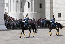 Церемония развода пеших и конных караулов Президентского полка Службы коменданта Московского Кремля (СКМК) Федеральной службы охраны (ФСО) России на Соборной площади Московского Кремля. Гвардейцы роты специального караула Президентского полка и зрители во время церемонии.