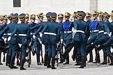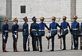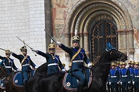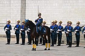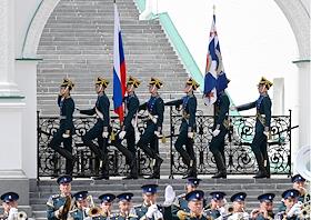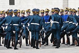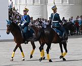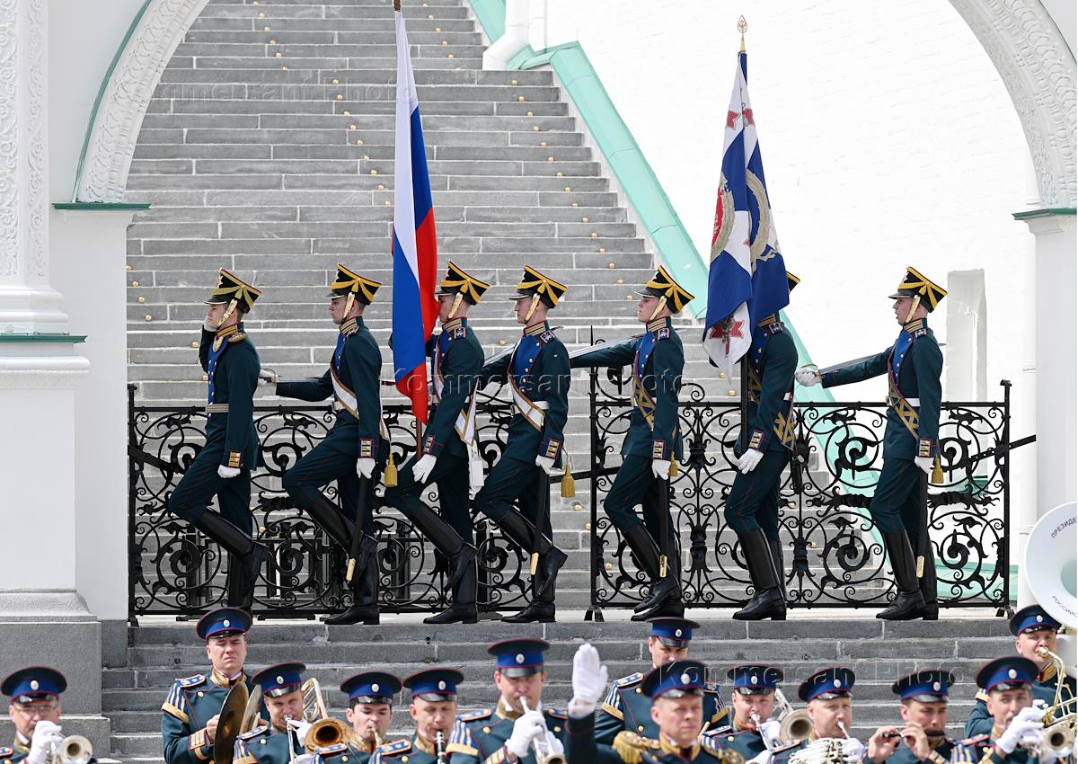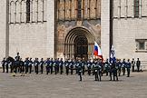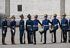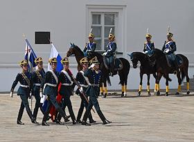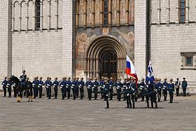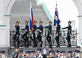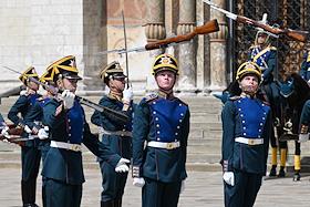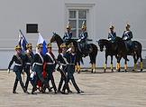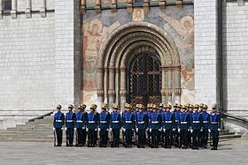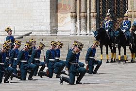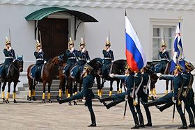 Церемония развода пеших и конных караулов Президентского полка Службы коменданта Московского Кремля (СКМК) Федеральной службы охраны (ФСО) России на Соборной площади Московского Кремля. Гвардейцы роты специального караула Президентского полка во время церемонии.