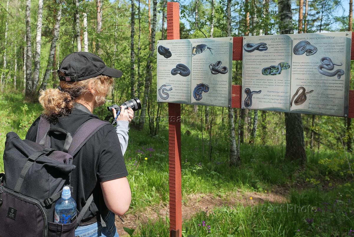 Природный парк "Оленьи ручьи". Жанровая фотография. Участница пресс-тура "Диванный сплав" на территории парка. Стенд с разными видами змей парка.
